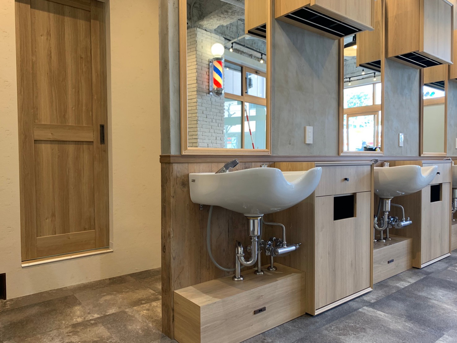 「男の社交場」と言われるクラシックな伝統的Barberスタイルではなく、コンクリートや明るい色味の木・白タイルを使用することでスタイリッシュな雰囲気にまとめました。