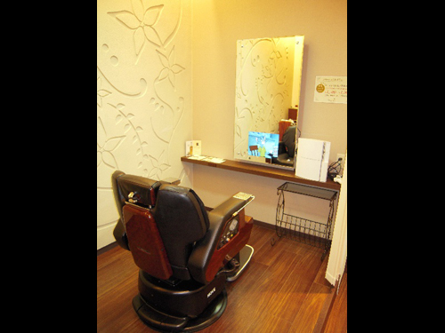 理容師資格をお持ちのオーナー様なので椅子はシェービングができるよう理容椅子を配置していますが、女性のお客さまも積極的に集客していけるよう理容室に見えないよう柔らかい色使いの空間となっております。