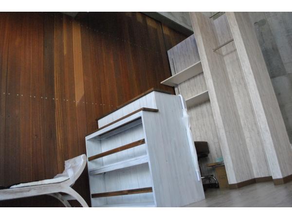 既存で使用していたウッドデッキ材を再利用し、壁面に貼る事によりアンティークな空間の演出をしております。