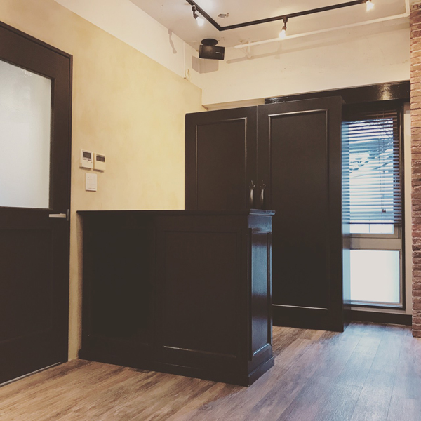 店内に足を踏み入れると重厚感のある、レジカウンター、特注クロークがあり、お客様のお召し物を大切にお預かりします。 床材にはアッシュグレー、ベージュカラーのジョリパッド、ウェットなブラック塗装が隠れ家サロンとして高級感を演出しています。