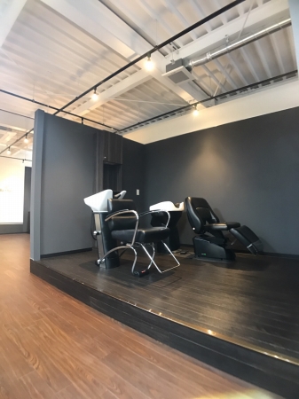ブラックの間仕切りにシャンプー台のレザー。アッシュグレイのトールキャビネットにダークブラウンの床材。カラーバランスを調整し落ち着いた雰囲気を演出しています