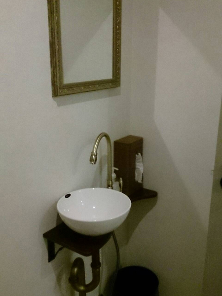化粧室前の洗面台はちょっぴりゴージャスな気分に浸れるヨーロピアンなミラーで変わった自分のお化粧直し。