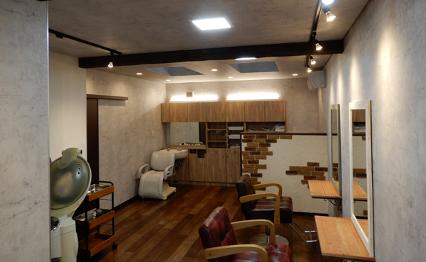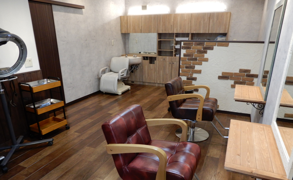 オーナー様こだわりのセット面は、遊び心を取り入れアンティークブラウンのセットイスにエイジング加工を施したグリーンのミラーとアンティークレッドのセットイスにホワイトのミラーを組み合わせ来店されるお客様をわくわくさせます。