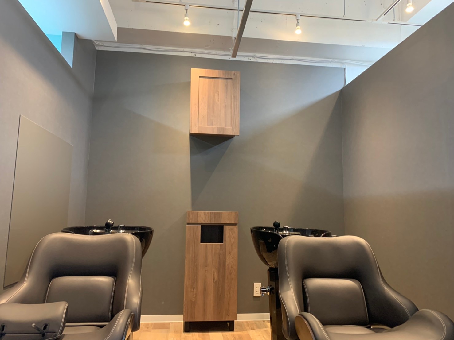 シャンプースペースは暗めの床やクロスでお客様がリラックスできる落ち着いた雰囲気に。