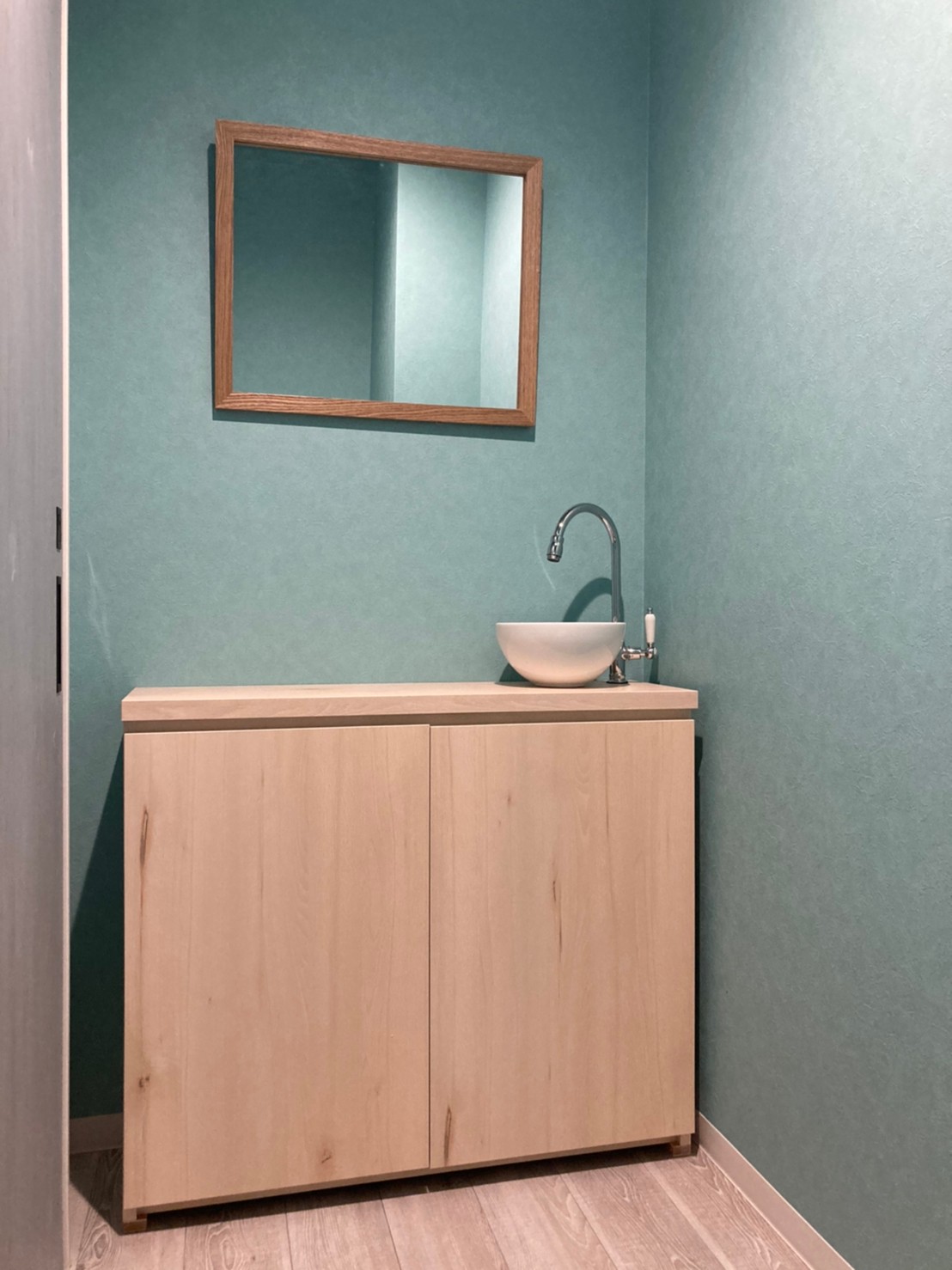 手洗いは収納付きの特注品。お化粧直しもできるような、広めのスペースを取っています。